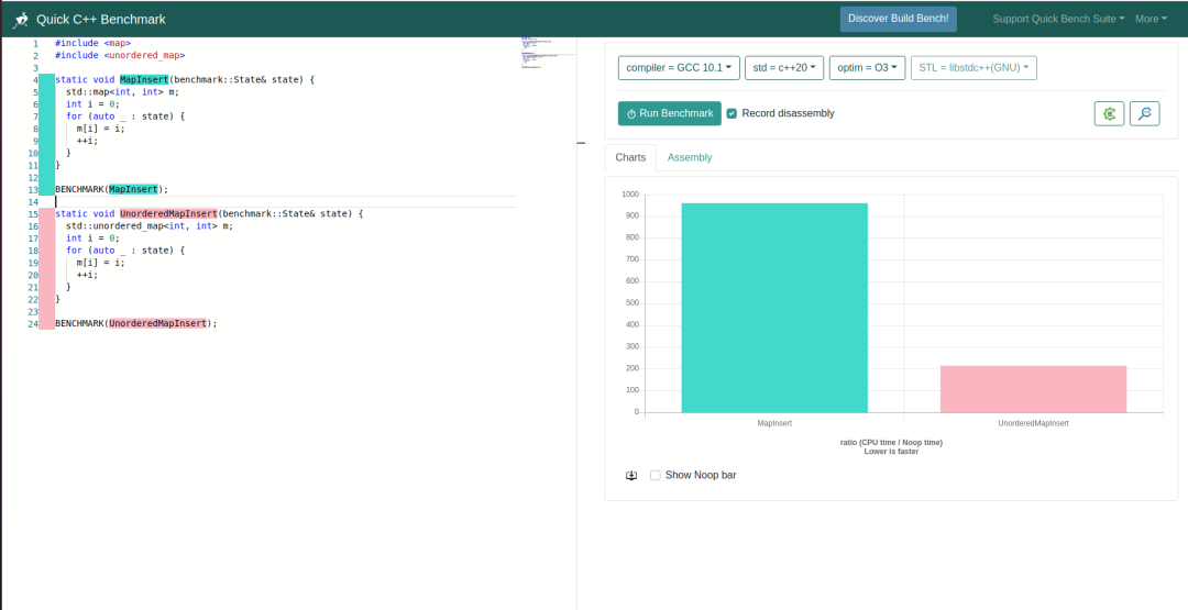 - 可以快速对一些 C++ 代码片段进行 benchmark 并可视化显示出来。
