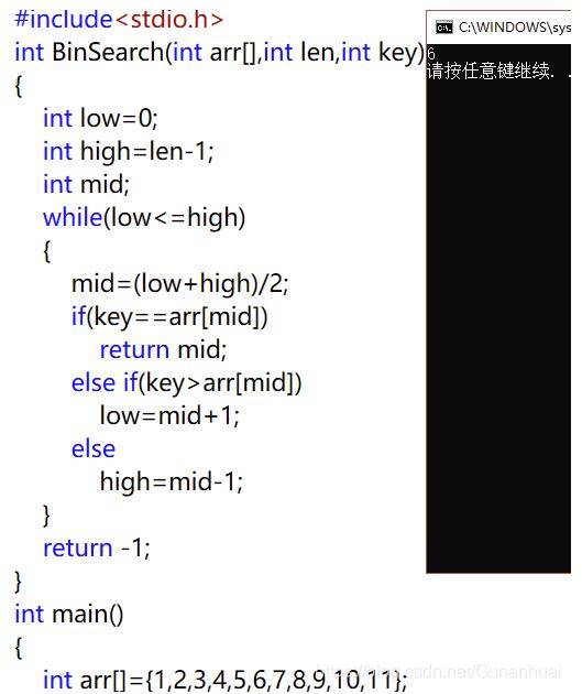 int BinSearch(int arr[],int len,int key) //折半查找法(二分法)