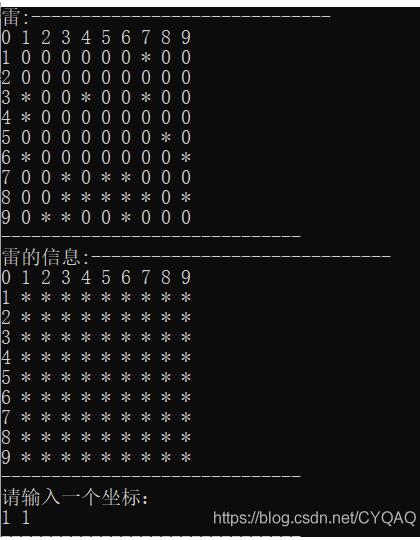 #define COL 9 char** creatMat(int row, int col); void intMat(char** Mat, int row, int col, char ch); void setMine(char** Mat, int row, int col); void showMat(char** Mat, int row, int col); int getMineNum(char** Mat, int row, int col, int x, int y); void game(char** mineMat, char** mineInfo, int row, int col);