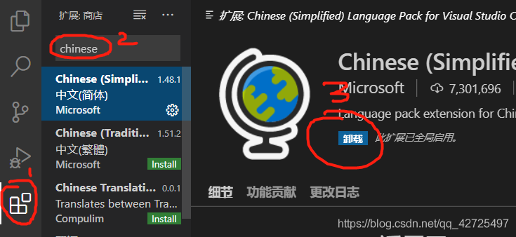2.安装完成进入VScode后按照步骤install中文插件完成汉化(此处我已完成汉化,故插件包显示“卸载”,未安装情况下此处应显示“install”);