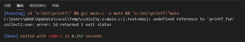 终端提示信息undefined reference to `printf_fun()',观察编译过程发现链接器没有编译printf.c文件,只编译了main.c文件(更别说链接了):