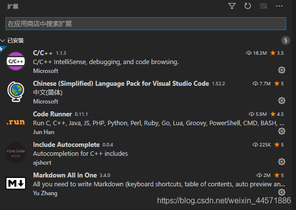 如图所示,第一个、第三个、第四个就是和运行有关的插件,先安装上。第五个就是在vscode中写markdown的插件,就是我正在写的,爱安装不安装。如图所示:
