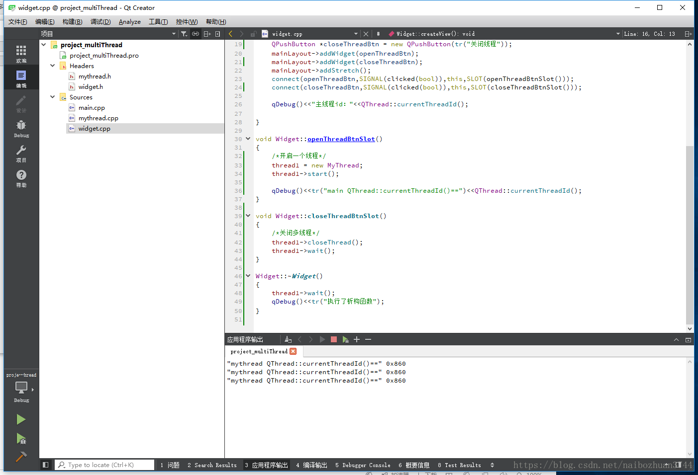 1.1新建一个widget工程,不要勾选ui界面。然后分别在mythread.h,mythread.cpp,widget.h,widget.cpp,main.cpp分别添加如下代码。