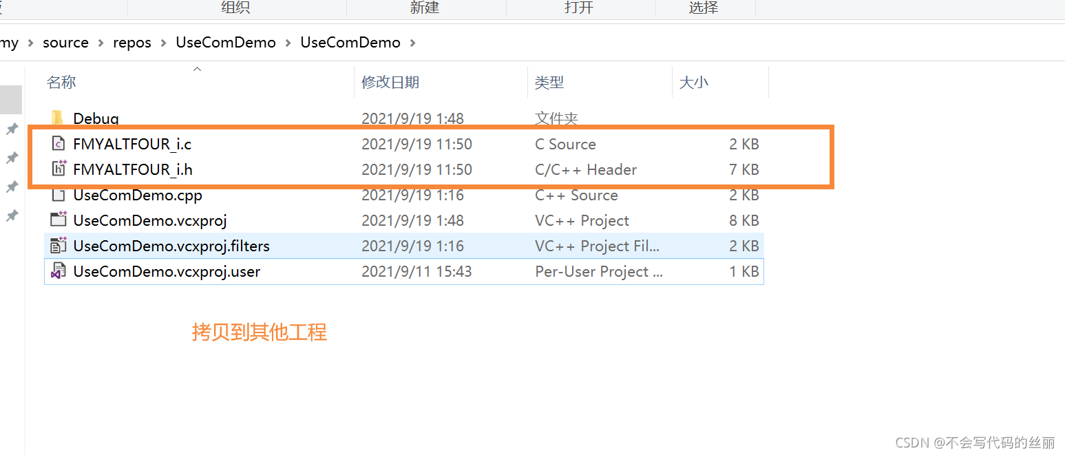 将上诉两个文件拷贝其他使用工程中(注意我们并没有拷贝dll)如下图所示: