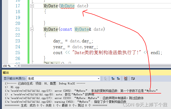 对于MyDate(const MyDate& date)参数列表中的const,因为复制构造函数参数另一个对象引用,如果不加const修饰,在此复制构造函数中可能会改变原对象的内容,为了安全起见,应加尽加。