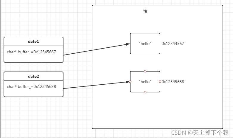 复制构造函数先检查date中的buffer_的字符串大小,然后分配此大小+1的内存给新创建的对象的buffer_(strlen函数不会计算' '字符),最后使用strcpy函数将date的buffer_指向的内存中的内容复制到新创建的对象的buffer_所指向的空间(strcpy函数会吧' '字符一并复制)。最后实现了两个指针指向了不同的存储空间(两个空间的内容相同)。