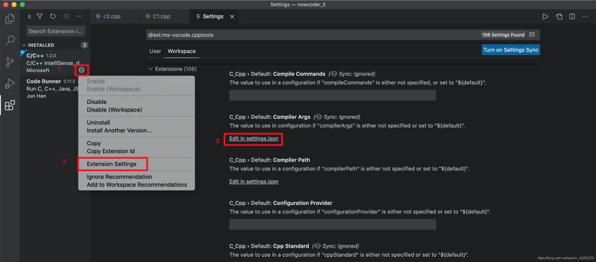 - 在 Compiler Args 的选项中,点击 Edit in setting.json