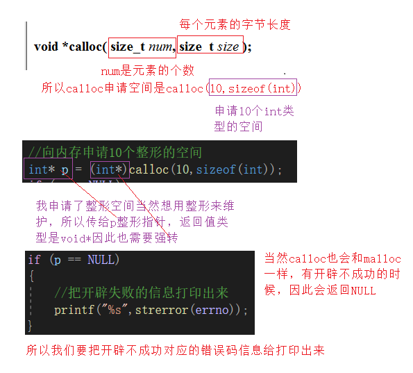 与函数 malloc 的区别只在于 calloc 会在返回地址之前把申请的空间的每个字节初始化为全0