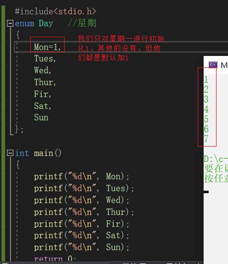 如果我们没有对枚举常量进行初始化的话,他们是默认加一的