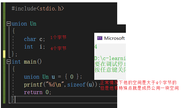 联合的成员是共用同一块内存空间的,这样一个联合变量的大小,至少是最大成员的大小(因为联合至少得有能力保存最大的那个成员)