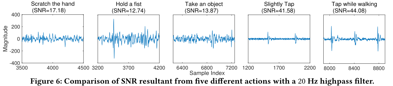 请注意,这些振动信号均由20Hz的Butterworth高通滤波器过滤。在上图中,我们观察到手指敲击(即使是轻微敲击)的信噪比(SNR)明显高于其他动作。因此,当信号信噪比超过某一阈值(默认为20dB)时,我们可以简单地分割出一个由敲击引起的振动信号。