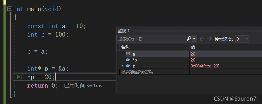 先从p的内存中取四个字节,即变量a的地址放入寄存器,再将20给到寄存器所存的的四字节中。完成对变量a的改变。