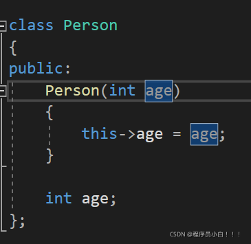 为什么呢 将上述代码中的age选中 然后会有下面这种情况 相信大家知道什么意思 就是编译器不会像人脑一样将左边的age看成类的属性age,所以就导致编译器认为上述3个age是一回事,所以再编译器中相当于Person类的属性age没有赋值,所以进行输出的时候就会用0xCCCCCCCC来进行填充,就有了输出是-858993460的答案