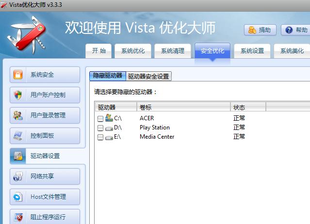 当然,你也可以通过Vista优化大师(点击下载)中系统优化-驱动器设置来方便地隐藏驱动器。