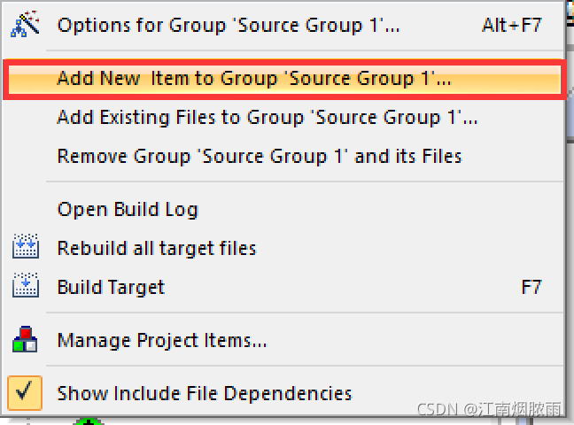 然后鼠标右键点击左边工程文件中的Source Group,选择Add New Item…
