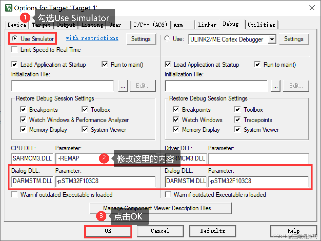 注意:需要勾选软件调试,然后修改参数。刚开始选择的芯片是stmf103c8,所以此处Parameter填写-pSTM32F103C8