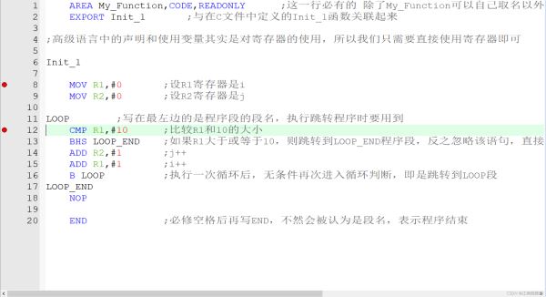 AREA My_Function,CODE,READONLY ;这一行必有的 除了My_Function可以自己取名以外,其他都是模板 EXPORT Init_1 ;与在C文件中定义的Init_1函数关联起来 IMPORT return1 ;声明return1为外部引用 ;高级语言中的声明和使用变量其实是对寄存器的使用,所以我们只需要直接使用寄存器即可 Init_1 ADD R0,#100 ;将传入的值+100 MOV PC,LR ;返回R0 LOOP ;写在最左边的是程序段的段名,执行跳转程序时要用到 CMP R1,#10 ;比较R1和10的大小 BHS LOOP_END ;如果R1大于或等于10,则跳转到LOOP_END程序段,反之忽略该语句,直接执行下面的语句 ADD R2,#1 ;j++ ADD R1,#1 ;i++ B LOOP ;执行一次循环后,无条件再次进入循环判断,即是跳转到LOOP段 LOOP_END NOP END ;必须空格后再写END,不然会被认为是段名,表示程序结束