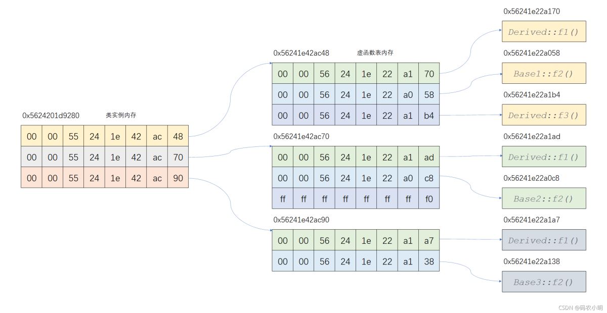 此时,sizeof(Derived) 等于24,可以基本确定类实例中有3个虚函数表指针。
