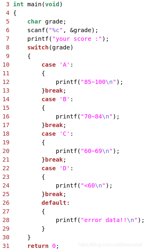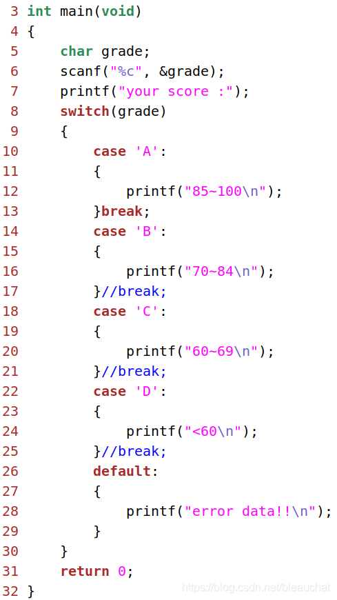 3)每一个分支语句后一般都要加一条break语句,用来跳出switch语句块,最后一个分支可以不加;如将上面的例子改为: