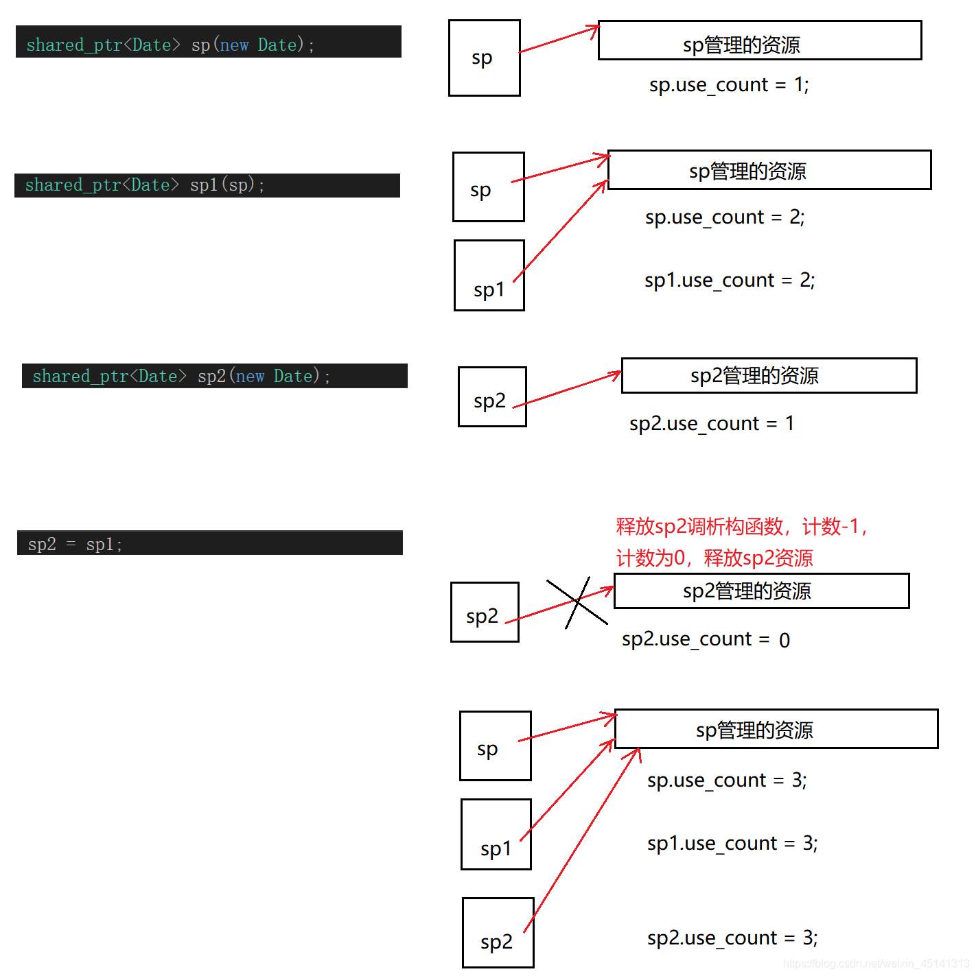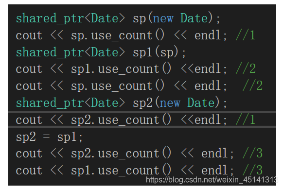 - shared_ptr的原理:是通过引用计数的方式来实现多个shared_ptr对象之间共享资源。shared_ptr在其内部,给每个资源都维护了着一份计数,用来记录该份资源被几个对象共享。