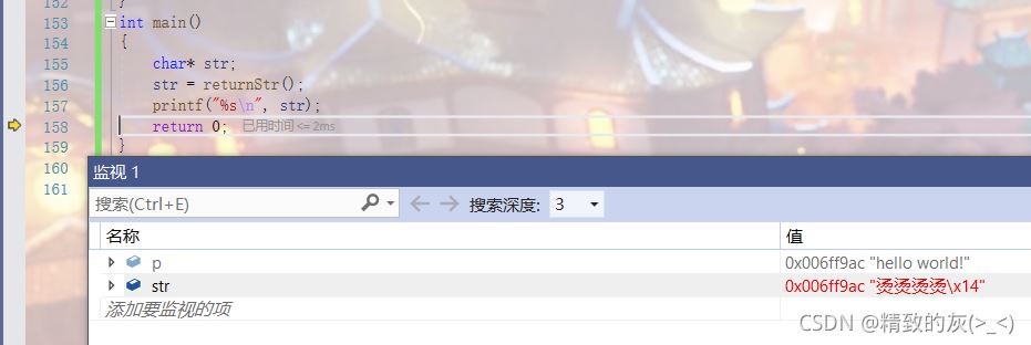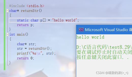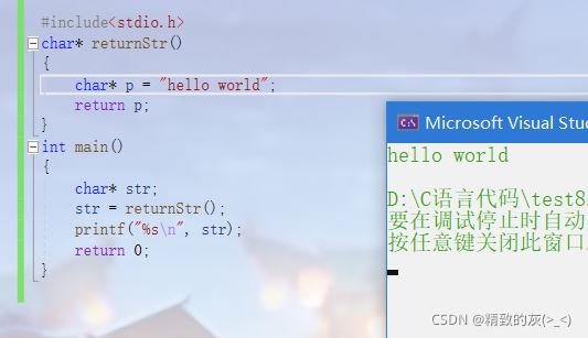 通过调试可以发现,当函数结束后,运行printf打印之前,str指向的空间中的字符串是在的: