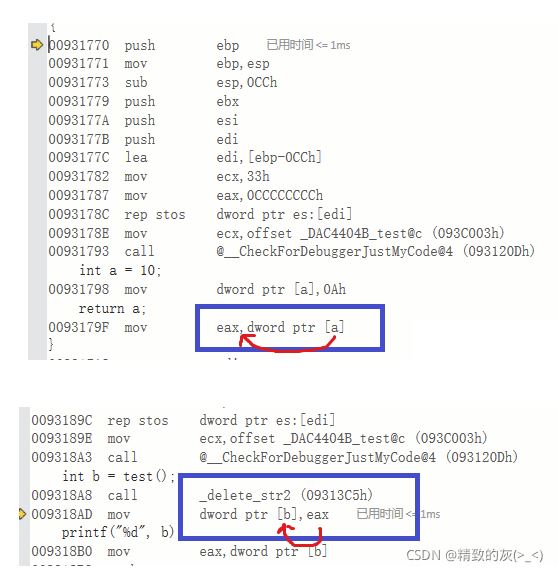 通过反汇编可以看到,局部变量a的值10通过寄存器交给了调用的b,所以即使局部变量a空间的10已经被修改,也不会影响b的内容: