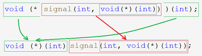 void (* signal(int, void(*)(int)) ) (int); typedef void(* pf_t)(int);//typedef简化代码 pf_t signal(int, pf_t);