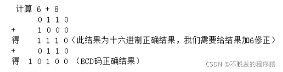 如果相加之和在 1010 到1111(即十六进制数 0AH~0FH)之间,则需加 6 进行修正。