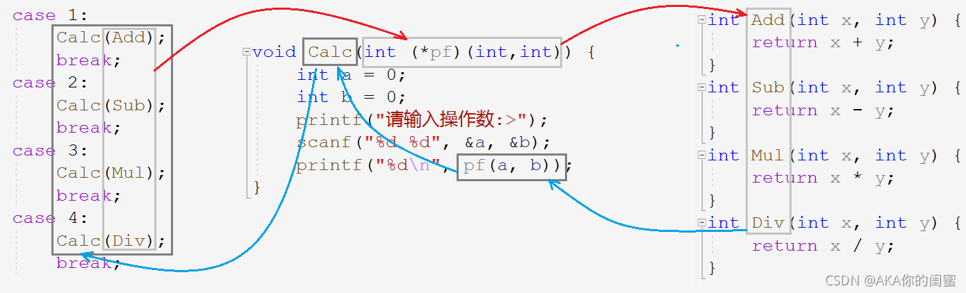 int (*pfArr[10]) (int, int) = { 0,Add,Sub,Mul,Div };//数组下标和选项序号匹配