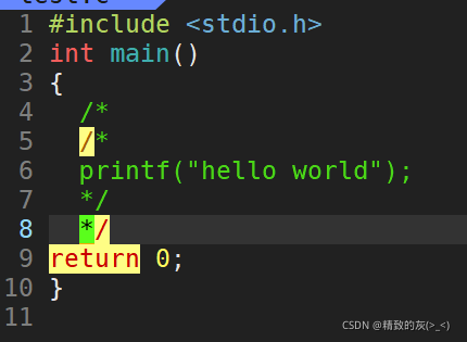 如果是C语言风格的注释出现了嵌套,则/*总是与离它最近的*/匹配,第二个/*并不会被认为是注释符号,因此第一个/*与第一个*/匹配,代码会剩下一个*/:
