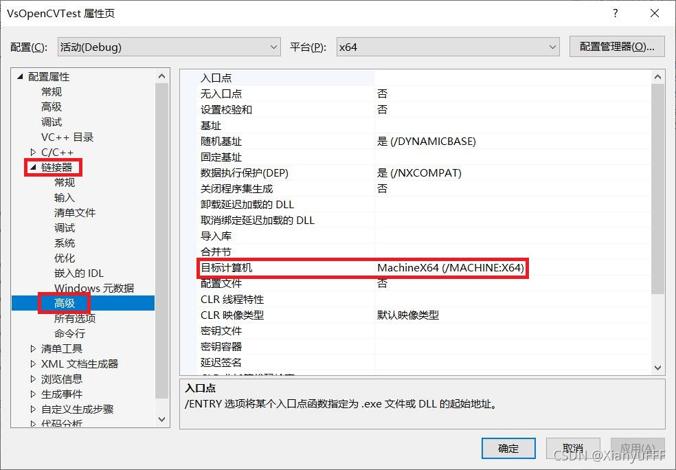 1. 双击“Debug|x64”->“链接器”->“高级”->“目标依赖项”->“X64”