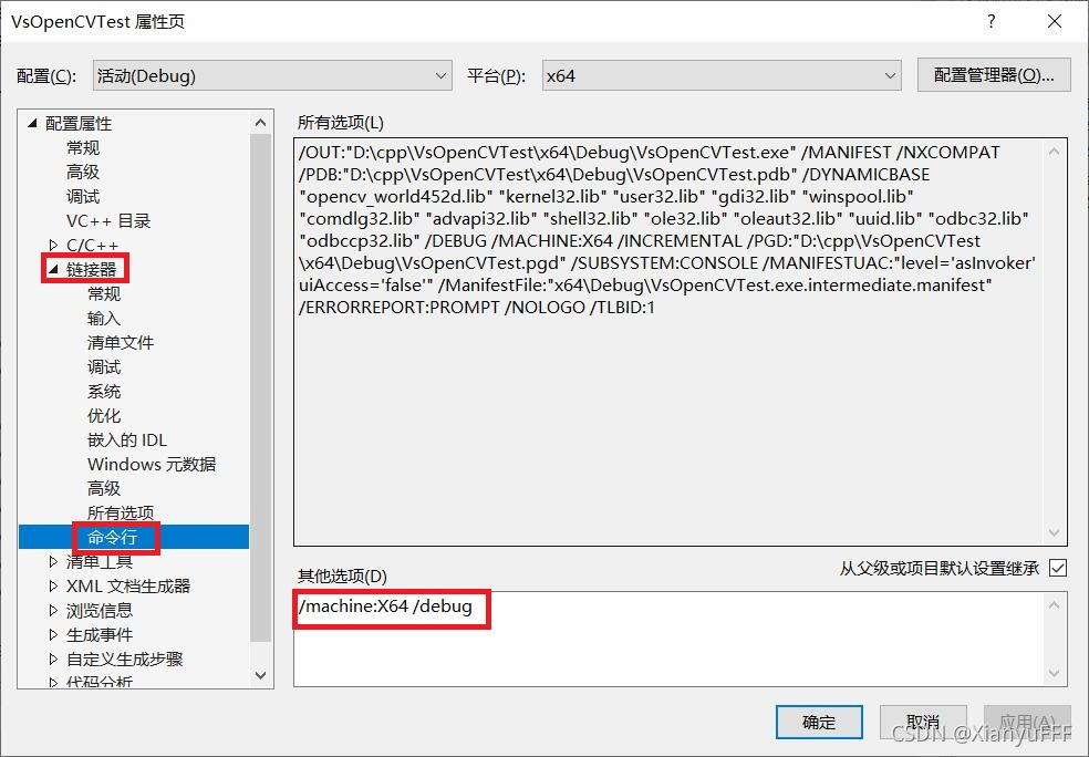 2.双击“Debug|x64”->“链接器”->“命令行”