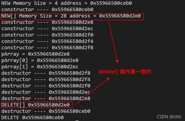 前面咱们说了new/delete与new[]/delete[]有一些不同,那我们先看看日志信息,请添加以下测试代码:
