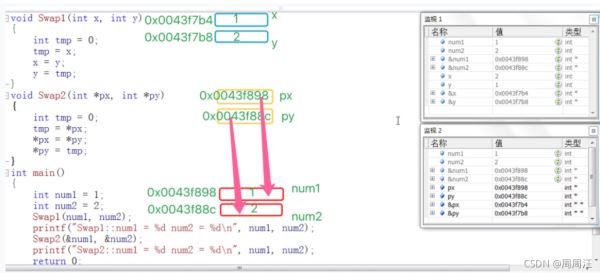 上面代码Swap1和Swap2函数中的参数 x,y,px,py 都是形式参数。在main函数中传给Swap1的num1,num2和传给Swap2函数的&num1,&num2是实际参数。