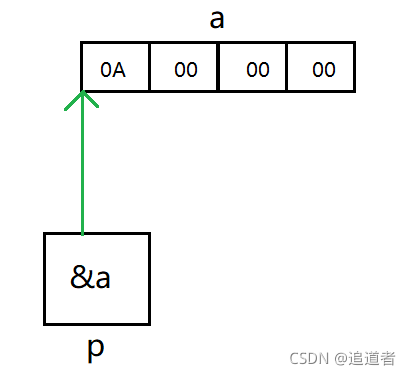 假设从左向右地址依次升高,那么 p 里面存放的就是 a 变量4字节中地址最低的那个字节的地址。