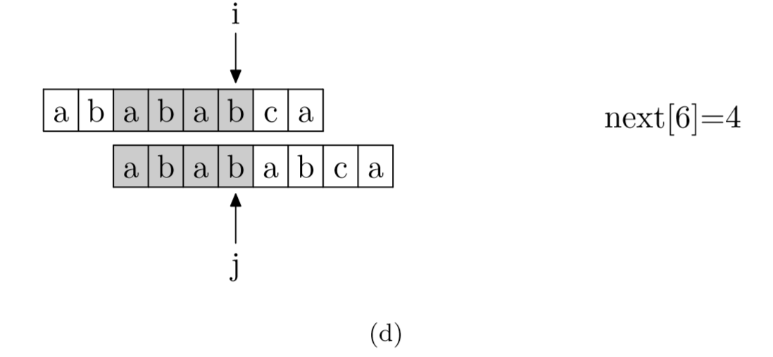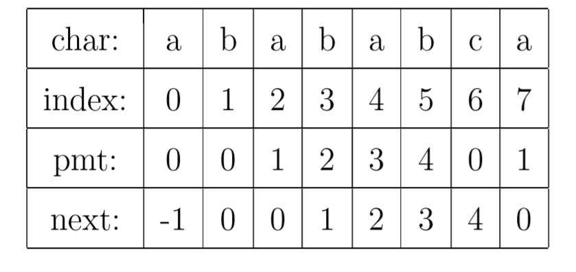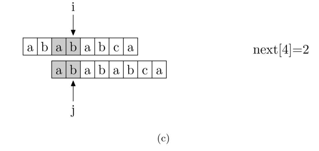 next[j] = k + 1;//将j视为指向一个子串(后缀)结束后的下一个字符,k指向一个子串(前缀)的最后一个字符,则这两个子串的重叠部分的长度(k下标从0开始)即PMT[j-1]的值