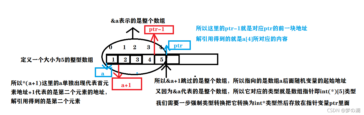 ②.定义了一个整型指针变量ptr用来存放地址,这里的存放地址是(&a+1)的地址,由于是&a,所以表示的是整个数组a,所以&a+1跳过的是整个数组,这里的地址是a数组后面的一块随机变量地址。因为指针指向的是整个数组,所以它的类型是int(*)[5](数组指针),所以我们在它的前面进行强制类型转换,把它转换为(int*)类型,然后再存放到指针变量ptr内部。