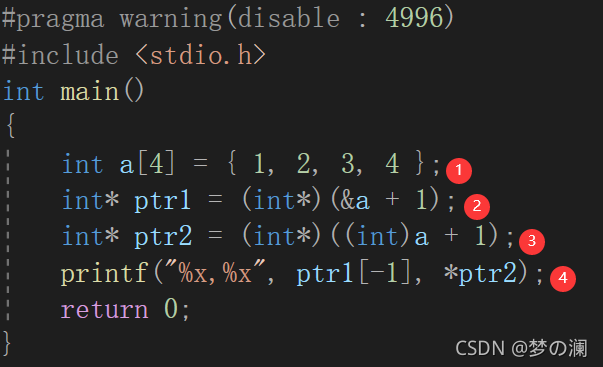 ③.这里的a单独放在括号内,代表的是数组的首元素地址,类型是(int*),在a的前面有一步强制类型转换把int*类型转换为了整型(int类型)加+1后,我们由上一题可以知道整型的数值+1地址也是+1个字节,然后再一步强制类型转换把它转换为int*的类型,把地址存储到指针变量ptr2中