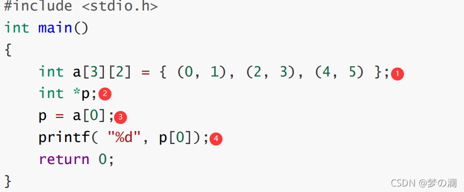 ③.指针变量p用来存放a[0]的地址,我们注意到这里的a[0],既没有&a[0]也没有sizeof(a[0]),所以这里的a[0]就是数组的首元素地址就是a[0][0]的地址,即就是数字1的地址,所以指针变量p存放的就是a[0][0]元素的地址