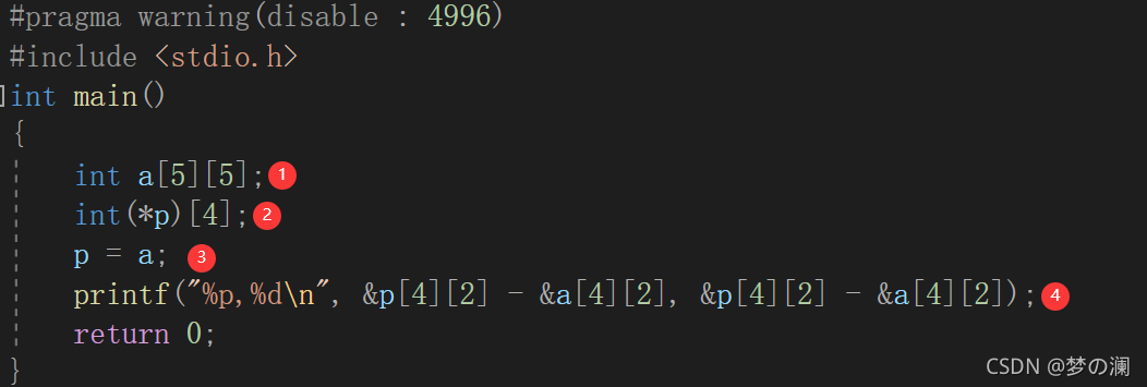 ③.将二维数组首地址赋值给数组指针,我们看到这里的类型是int(*)[4],而二维数组明显是有5列的所以明显这个数组指针不能存储整个二维数组,只能存储一部分。