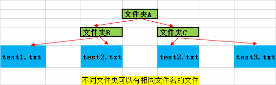 l例如:一个文件夹(目录)中可以包含多个文件夹,每个文件夹中不能有相同的文件名,但不同文件夹中的文件可以重名。