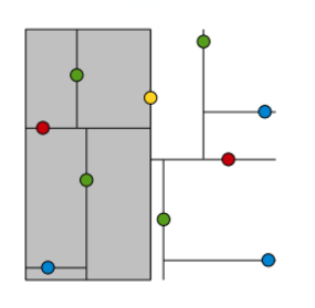- 数据只存放在叶子结点,而根结点和中间结点存放一些空间划分信息(例如划分维度、划分值)。