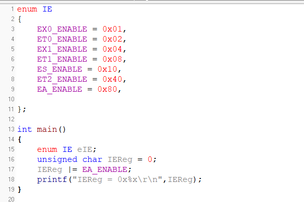 这些枚举值都是针对寄存器IE的固定值,所以我们可以称这些值是同一个类型的数据,我们把他们重新命名一下,便于阅读和记忆,这就是枚举的重要作用之一。