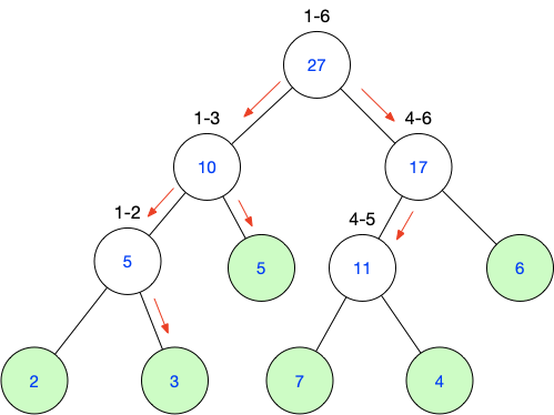3)每个父结点记录它表示区间的范围,如上图的“1-2”表示1到2的区间