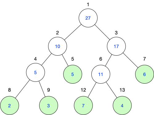 2)每个父结点是它的两个子节点的值的和