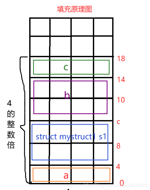 分析:首先是整个结构体,整个结构体变量4字节对齐是由编译器保证的,我们不用操心。 第一个元素a,a的开始地址就是整个结构体的开始地址,所以自然是4字节对齐的。但是a的结束地址要由下一个元素说了算。第二个元素b,因为上一个元素a本身占4字节,本身就是对齐的。所以留给b的开始地址也是4字节对齐地址,所以b可以直接放。 b的起始地址定了后,结束地址不能定(因为可能需要填充),结束地址要看下一个元素来定。然后是第三个元素c,short类型需要2字节对齐(short类型元素必须放在类似0,2,4,8这样的地址处,不能放在1,3这样的奇数地址处),因此c不能紧挨着b来存放,解决方案是在b之后添加1 字节的填,然后再开始放c。c放完之后还没结束, 当整个结构体的所有元素都对齐存放后,还没结束,因为整个结构体大小还要是4的整数倍。