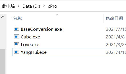 在Windows操作系统中,凡是.exe的文件,都可以作为一条命令,在命令行中来执行。例如:在我的电脑D盘cPro文件夹中就有很多编译好的.exe可执行文件: