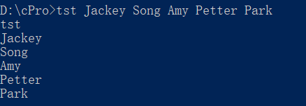 其中tst是这个可执行程序的名字,后面一堆是它的参数。argv[0]的值为tst,argv[1]的值为Jackey,argv[2]的值为Song,往后以此类推。参数的个数是不固定的。