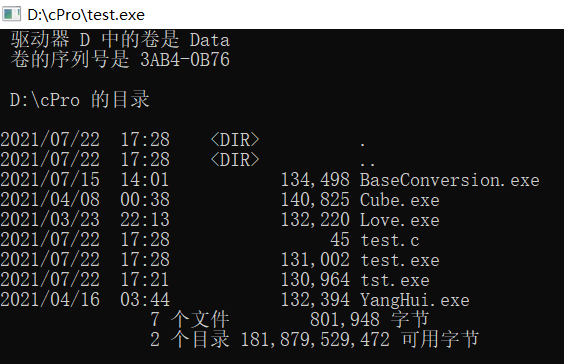 也可以写一个程序,让这个程序自动在命令行输入命令,例如输入命令dir列出当前文件目录下的所有文件:
