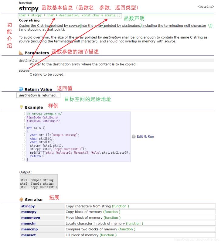 为了掌握库函数的使用方法的学习,我们可以参照权威网站 cplusplus 的解析为样本,一般在不同的平台上也是大同小异。一般都是按照这样的顺序对函数进行解析。